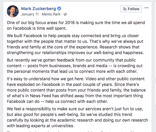 11 января 2018 года Марк Цукерберг выпустил пост на Facebook, в которой говорится о полном пересмотре традиционной ленты новостей в пользу «значимых взаимодействий».