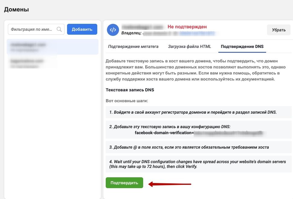 4) Возвращаемся в ФБ и жмем кнопку "Подтвердить". Готово. Теперь домены должны быть подтверждены в ФБ.