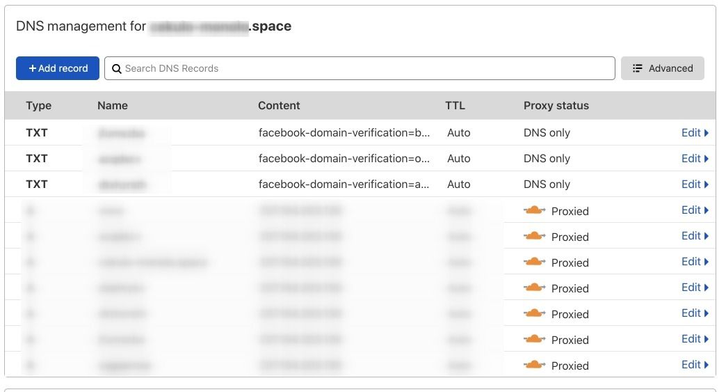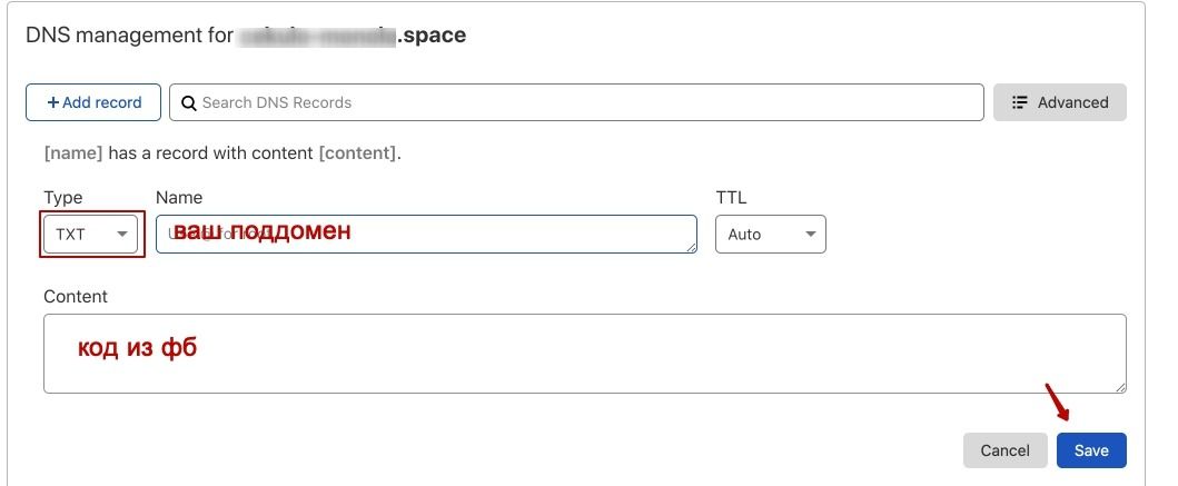 2) Заходим в CF, выбираем домен, переходим во вкладку DNS. Добавляем TXT-записи из ФБ, но в поле Name вместо "@" прописываем наш поддомен. Это действие проделываем для всех поддоменов, которые хотим добавить в БМ.