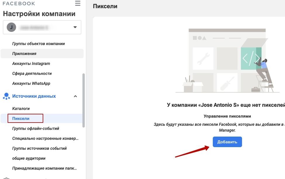 5) Теперь нужно создать пиксель. Для этого идем в БМ -> Источники данных -> Пиксель и создаем пиксель через кнопку "Добавить".