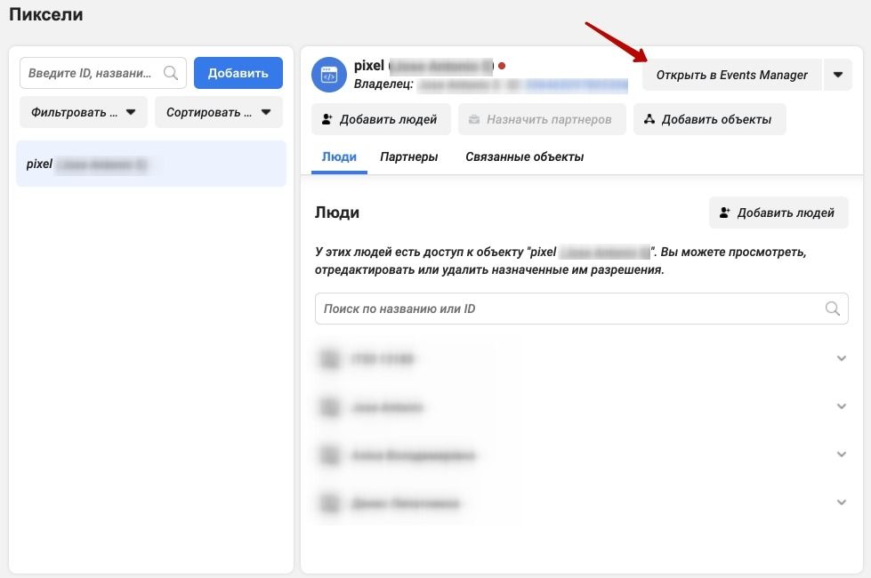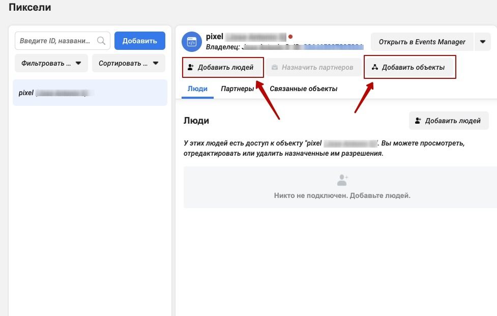 6) Назначаем созданному пикселю людей и расшариваем рекл.аккаунты
