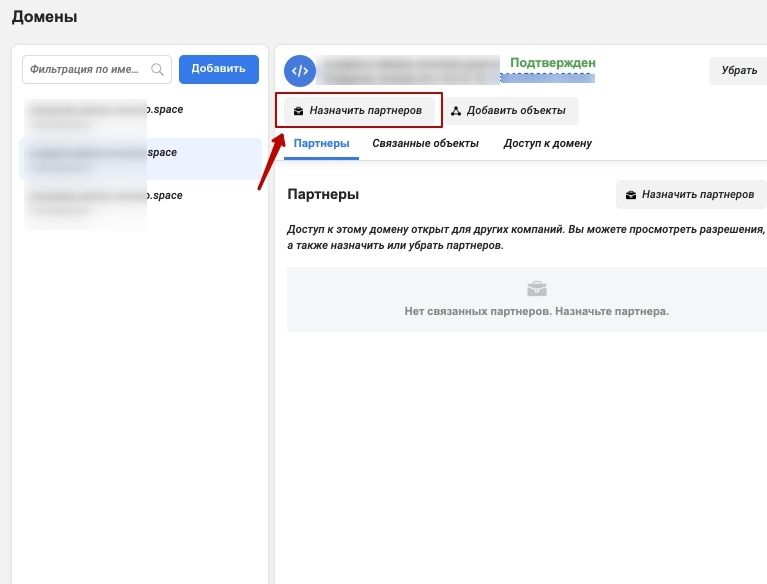 Но можно расшарить добавленные домены на другие БМы через добавления партнеров. Но в этом случае не забывайте расшаривать и ваш пиксель.