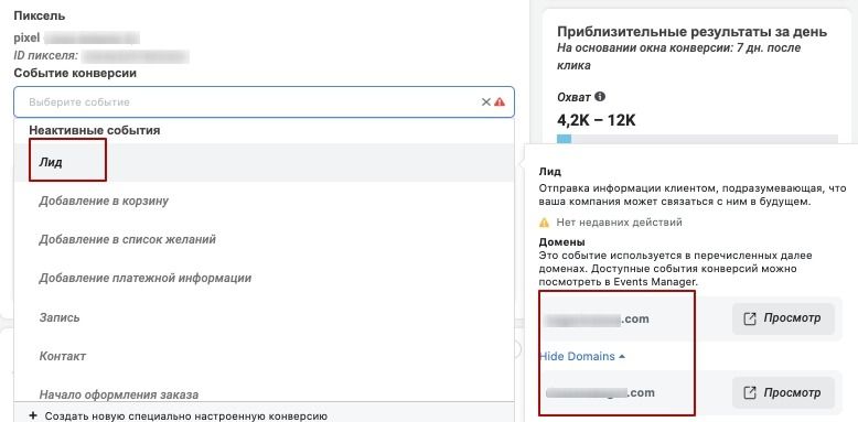13) Готово. Теперь можно запускать кампании за Лиды (изначально событие Лид будет неактивным, но после первой зарегистрированной конверсии, это исправится. Можете самостоятельно прокинуть тестовый лид). При настройке РК и выборе события конверсии, справа, можно будет увидеть разрешенные домены для этого события.