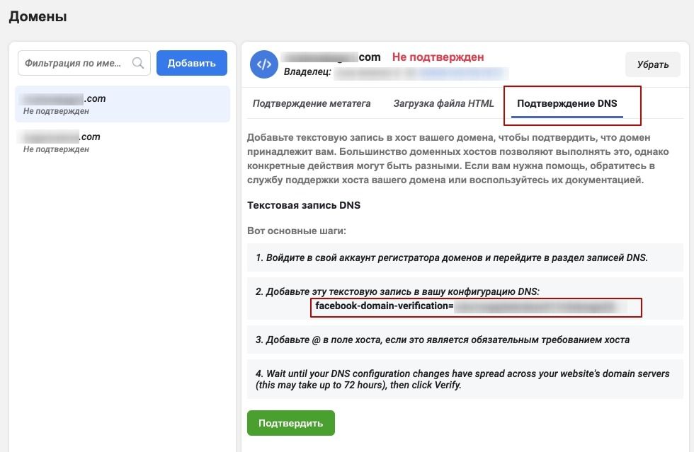 3) Возвращаемся в ФБ, в настройки доменов, жмем кнопку Подтвердить. Готово.