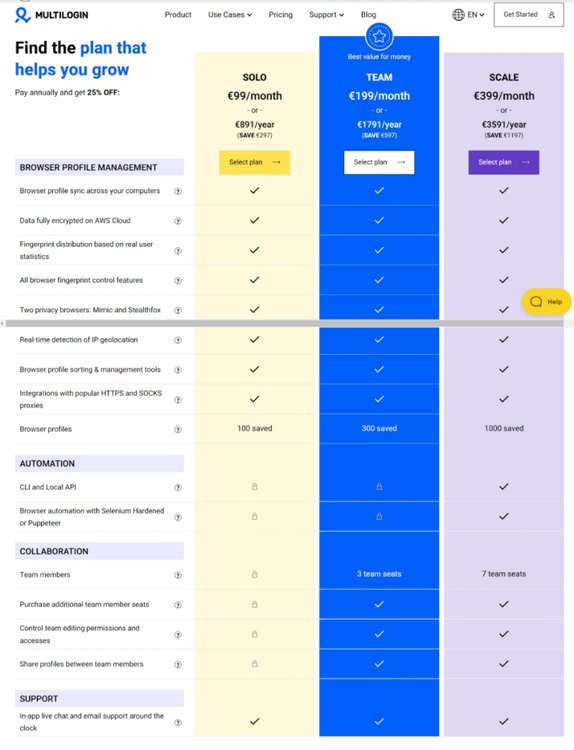 O preço excessivamente caro do Multilogin sempre foi controverso. Atualmente, o menor plano custa US$ 120, e você deve pagar um mínimo de US$ 244 por mês se optar por se inscrever no plano de automação.