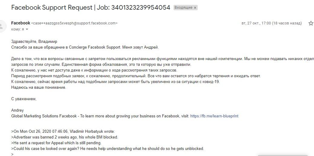 Всем привет. Впервые пишу тут, что либо, сильно не ругайте.) Год назад верифицировал БМ, получилось хорошо количество кабинетов росло каждую неделю дошло до 90, стоит учесть, что я не наглел и берёг БМ, лил только белое. За год отлил с этого БМ больше $120К, баны конечно бывали, и всего БМ и акков, но всегда всё решалось простым заполнением формы, неделю назад забанили весь БМ, на формы никто не отвечает, саппорт как всегда говорит, что ничего не знает, не решает такие вопросы, маркетолог с которым раньше общались игнорирует письма (даже в ФБ ей писал в соц акк). Может вы коллеги знаете, что ещё можно придумать, куда постучать.