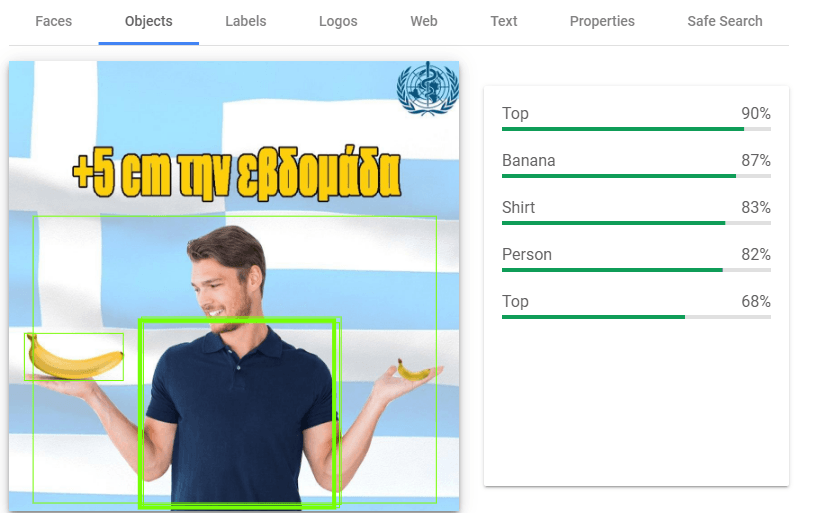У нас он увидел Top (верх одежды), Banana (банан), Shirt (саму рубашку), Person (человек) и снова Top.