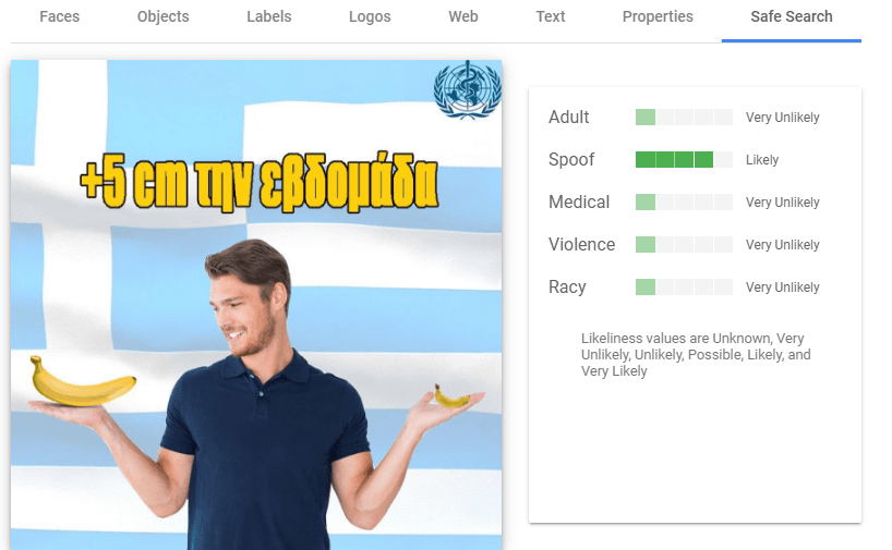 Одна из важнейших вкладок - здесь содержится информация о том, к какой категории можно отнести контент на картинке в целом. В случае с нашим креативом это точно не контент для взрослых (Adult), но при этом явный обман (Spoof).