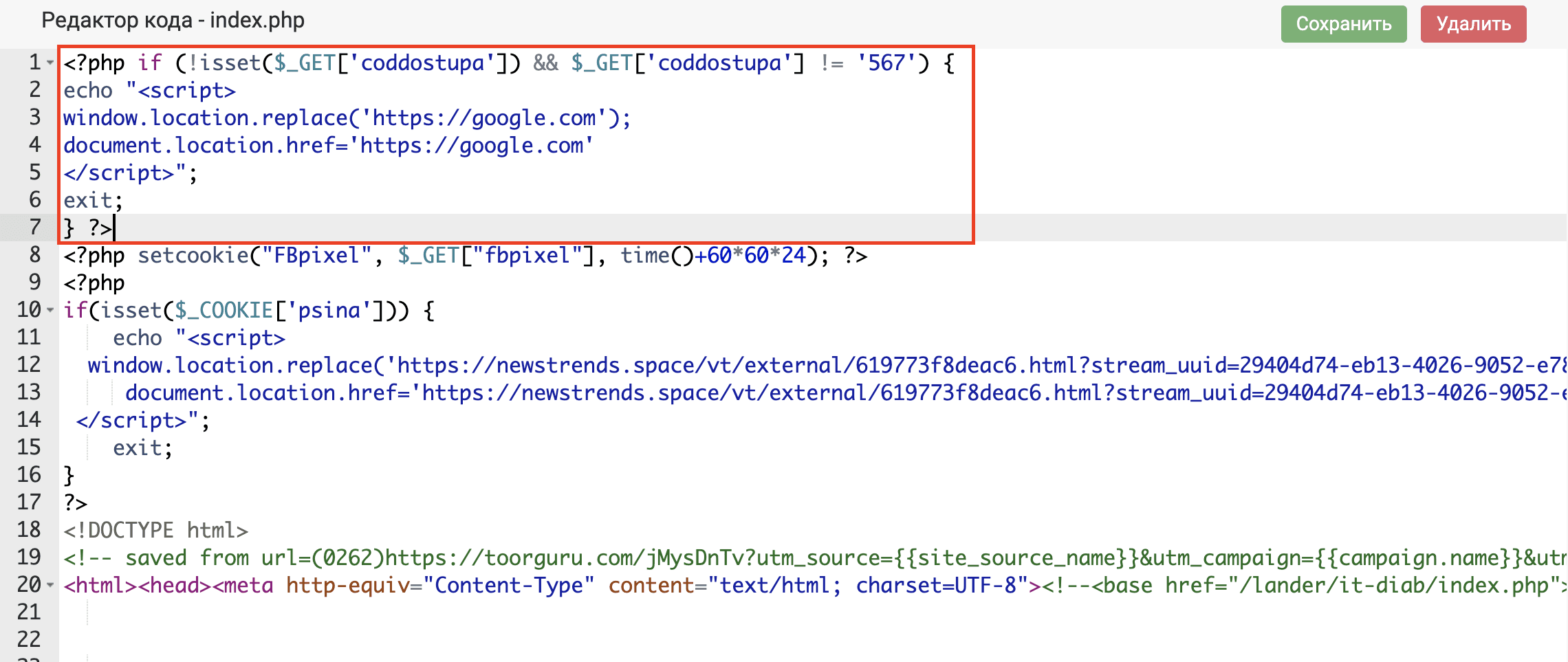 В итоге получается, что ца с фб переходит с нашим параметром на ленд, скрипт проверяет соответствие параметра заданному значению и тк все сходится, показывает ленд. В то же время, если наша рк светится в спае, там параметров ссылки не видно, только домен. А при переходе без этого параметра, скрипт видит несоответствие и перекидывает того, кто решил посмотреть ленд по ссылке (в данном примере на Google)Почему я в начале статьи написал «но это не точно»? Потому что сейчас спай не видит параметры, прописанные таким образом, а потом может научится, такого я знать не могу.
