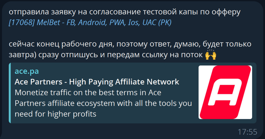 • Вместе с менеджером выбрать оффер и проклу по нему