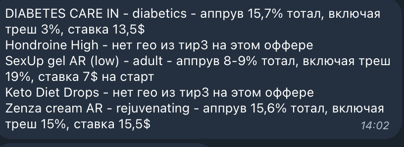 1 сообщение: "Bururan CO - prostatitis ставка на старт 14,5$ далее возможен бамп до 18-19, апрув тотал 31% Апрув действительно 84% за июнь от валидных лидов, апрув вместе с трешем указала выше "