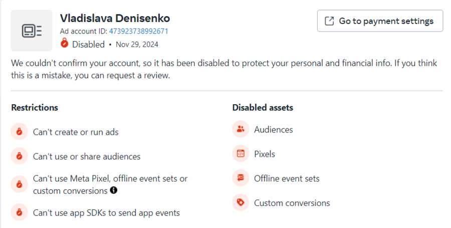 Привет бро, ну судя по ответу, так как ты не смог предоставить им никакую информацию касательно платежки, с аккаунтом ты можешь попробшаться, так как никакие функции кроме личного профиля в нем больше тебе доступны не будут.