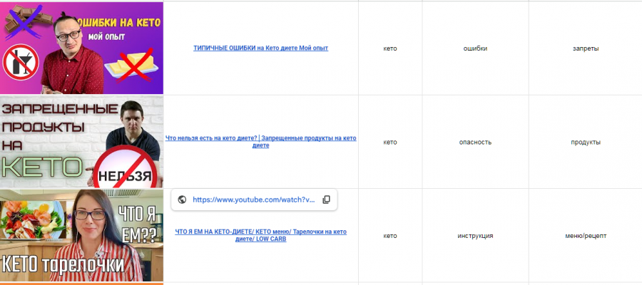 3) Создаём ещё одну табличку "Триггеры" и вносим туда превьюхи топовых видосов
