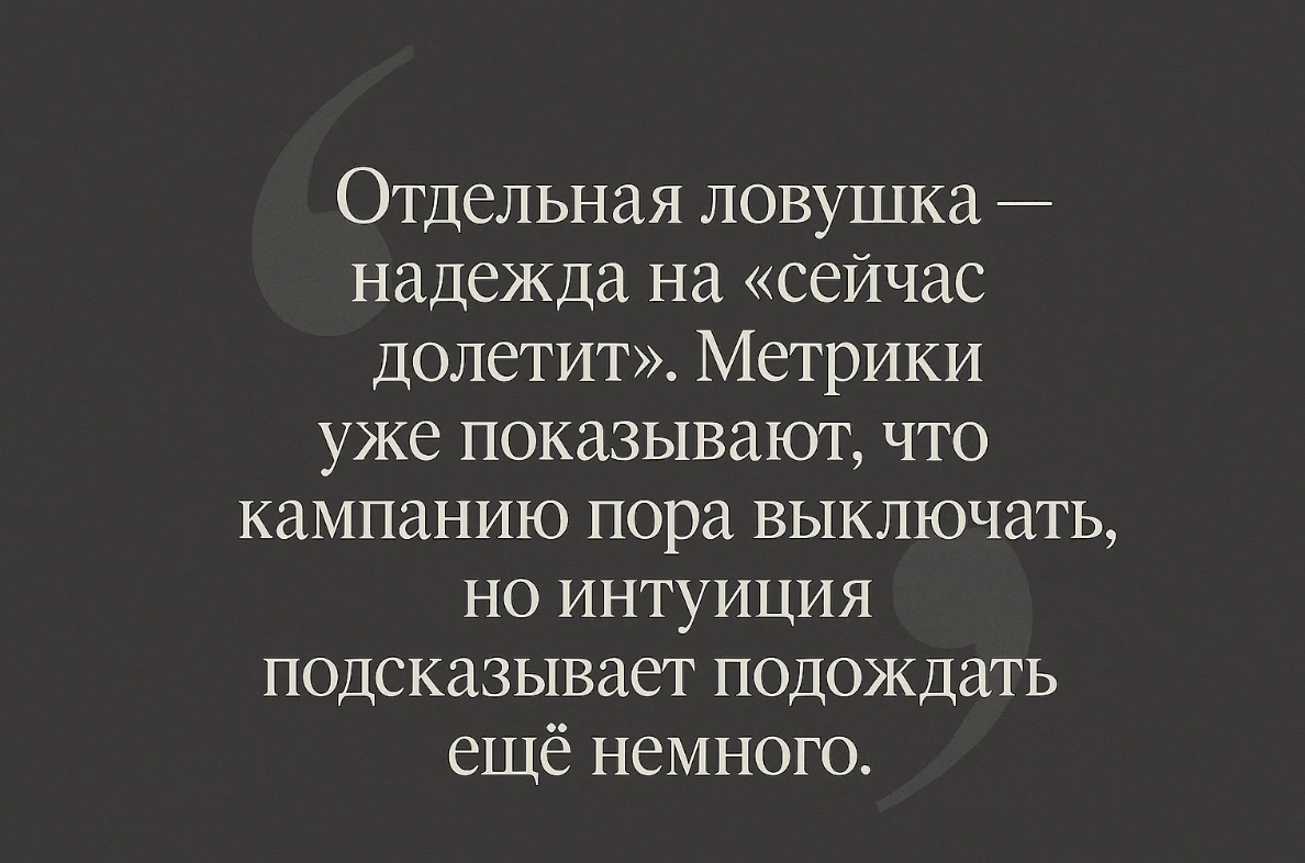 В арбитраже опасны не только технические ошибки, но и психологические установки. Именно они подталкивают к решениям, которые кажутся «логичными» в моменте, но в итоге приводят к убыткам.Ошибка невозвратных затрат. Когда в кампанию уже вложено много денег, трудно остановиться. Кажется: «столько потрачено — грех выключать». Но цифры показывают обратное: кампания убыточна, и продолжать ее бессмысленно.