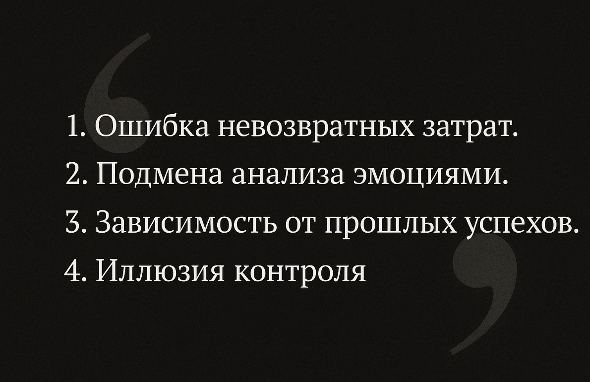 Зависимость от прошлых успехов. Если связка когда-то приносила профит, возникает желание запускать ее снова и снова, даже если рынок и условия уже изменились. Интуиция тащит в прошлое и мешает трезво оценивать текущую ситуацию.