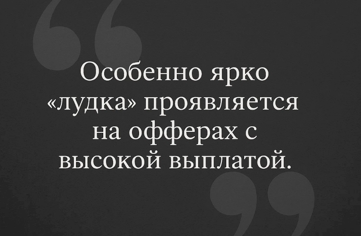 Арбитраж легко превращается в азартную игру. Вы начинаете с тестов и анализа, но со временем все чаще решения принимаются не на основе цифр, а под влиянием эмоций. Включается надежда: «еще немного подождать — и кампания выстрелит».Особенно ярко «лудка» проявляется на офферах с высокой выплатой. В Tier-1 за один депозит можно получить $200 и больше, и здесь легко уговорить себя докрутить еще $10–20: «сейчас прилетят лиды и все перекроют». На практике чаще всего это приводит только к еще большему минусу.