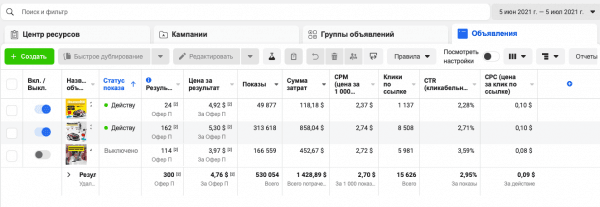 Потрачено на трафик: 1428$ (результат по 1 кабинету с бюджетом 50$ в сутки)
