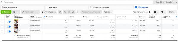 Потрачено на трафик: 1487$ (результат по 1 кабинету с бюджетом 50$ в сутки)