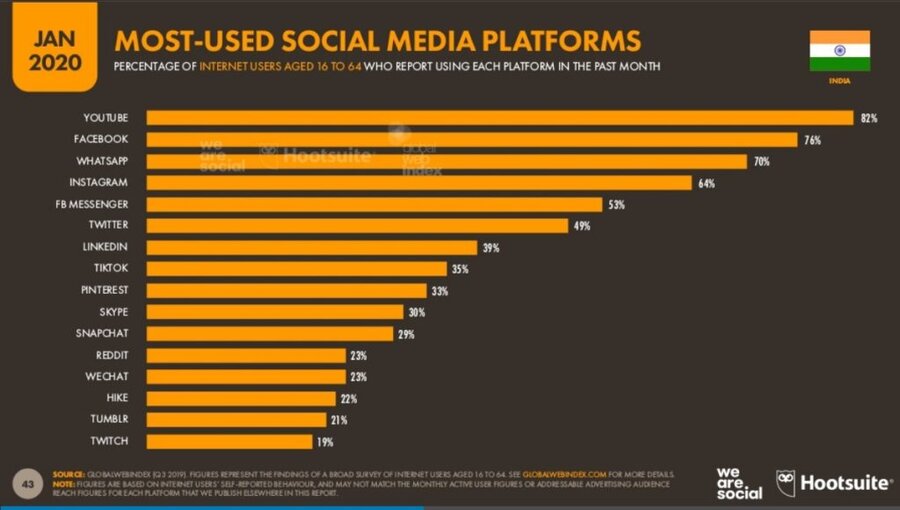 YouTube: платформа насчитывает 476 миллионов пользователей, из-за чего она охватывает 61% пользователей интернет пользователей в Индии. Обхватывает два рынка, как и “Индия”, так и “Бхарат”.