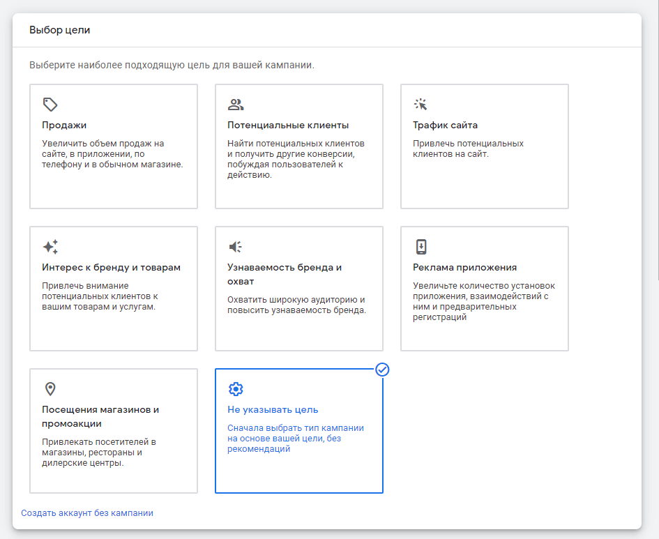 Базовые настройки рекламного кабинета предполагают помощь в создании рекламной кампании. Вебмастер может выбрать одну из предложенных целей или отметить поле «Не указывать цель».