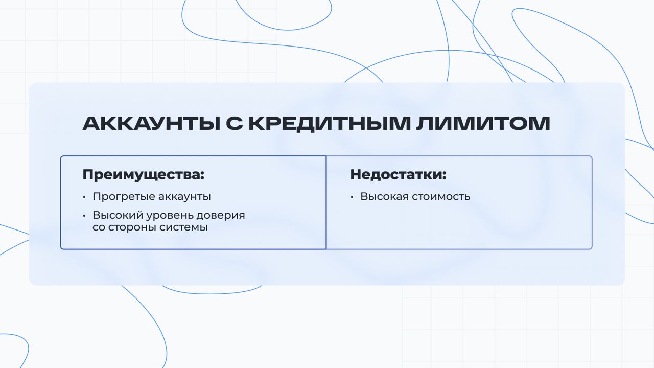- Аккаунты с кредитным лимитом. Аккаунты с открученным рекламным бюджетом, которые регистрируют с помощью банковских карт.
