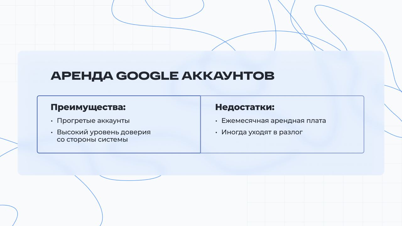 - Аренда Google аккаунтов. Реальные аккаунты пользователей, которые те готовы предоставить в аренду за определенную сумму. Стоит учитывать, что история активности таких аккаунтов должна превышать полгода.
