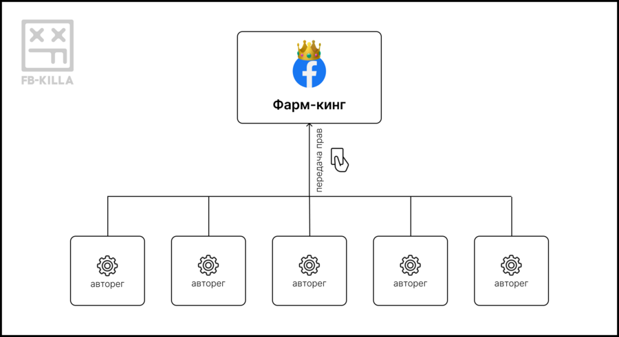 Передача прав достаточно проста. Вам нужно лишь добавить в друзья профили авторегов на профиль фарм аккаунта (Кинга) и передать рекламный кабинет на управление отметив Кинг в качестве администратора.