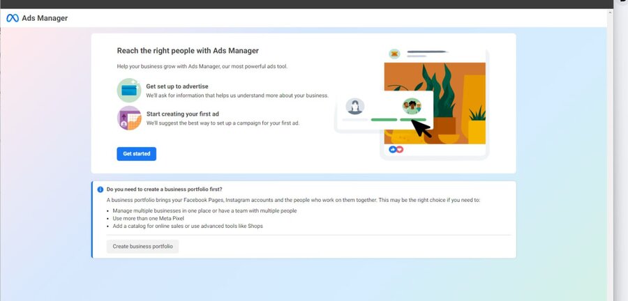Првиет бро!) Ничего страшного, это совершенно обычный вопрос... Не парься крч) В общем, сейчас FB обновляет интерфейс свого рекламного кабинета и в целом происходит обновление алгоритма. Поэтому, если встречается подобный вид, ничего страшного кликай "Get Started" и выбирай сферу Health... Дальше выбирал Manual и попадешь в рабочий интферфейс FB ADS) Удачи братик!)