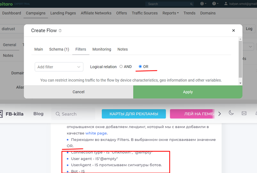 Трекер направляет клики в зависимости от заданных в потоках фильтров. Это позволяет отсеять ботов и модераторов Facebook, а также вести статистику по офферам.